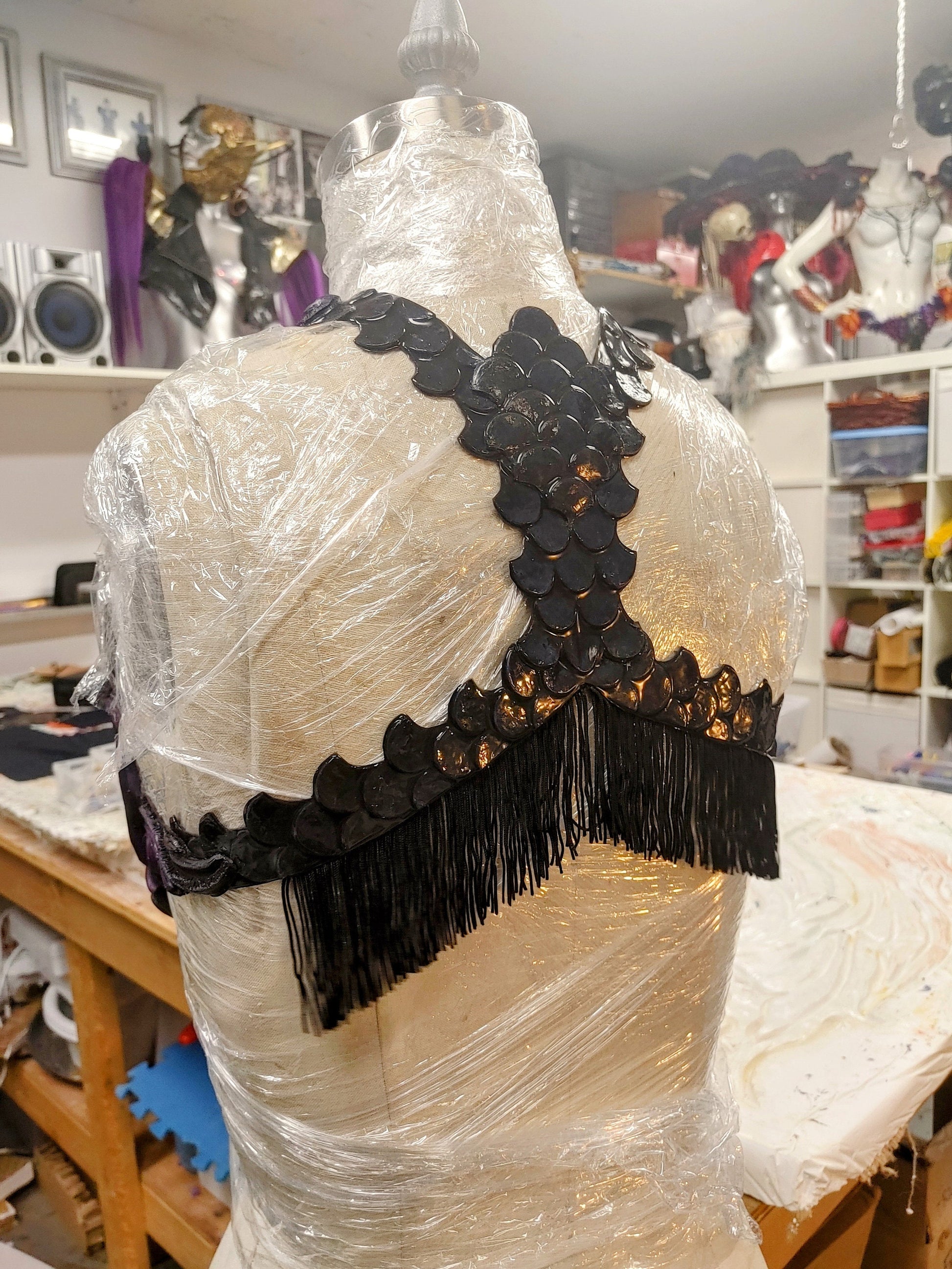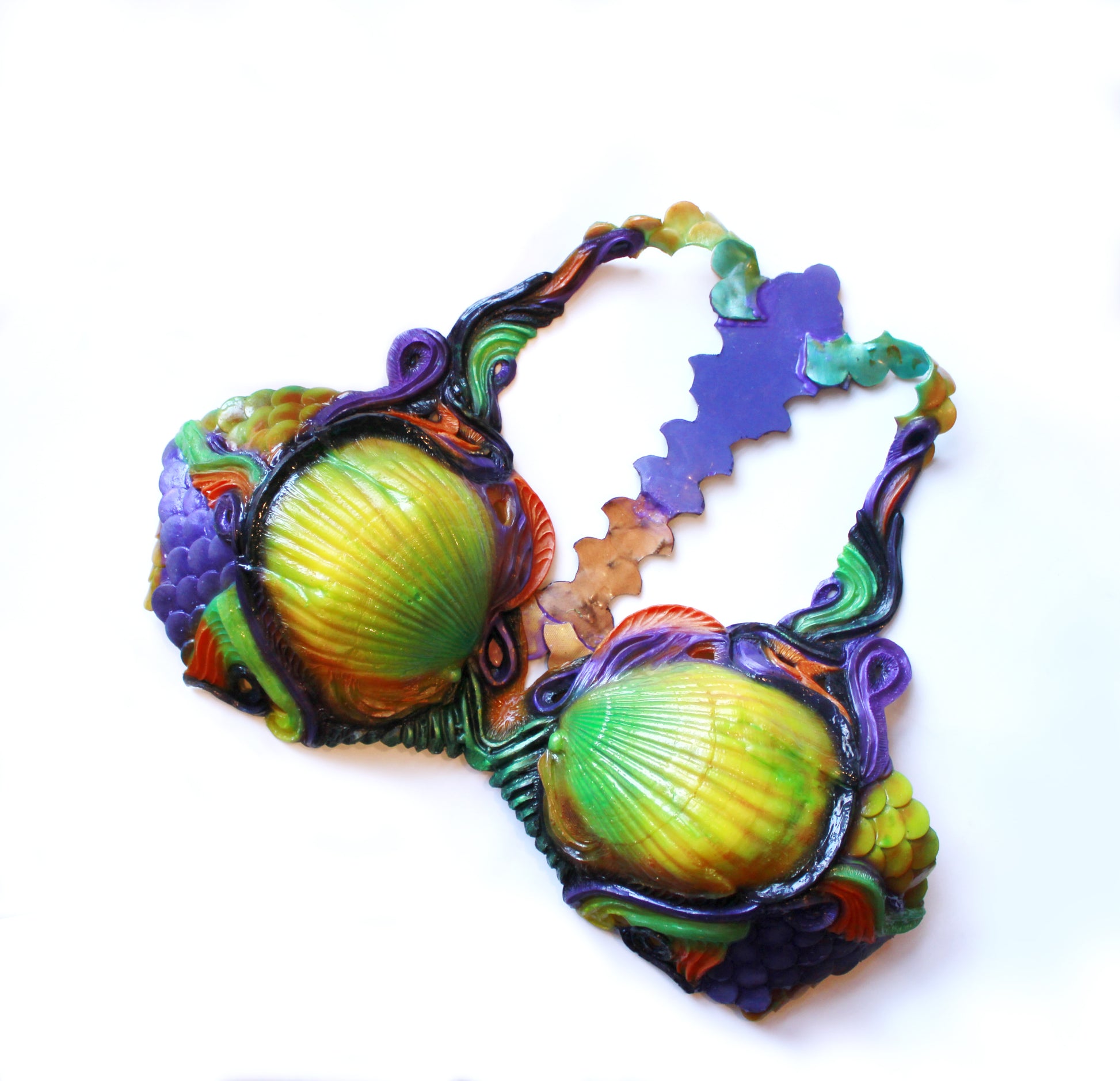 It's a fantasy silicone bustier with the look of a mermaid from another world! A mermaid wearing this shelltop as an armor with organic flouriches like gills to breath in the nil of the space or the see!