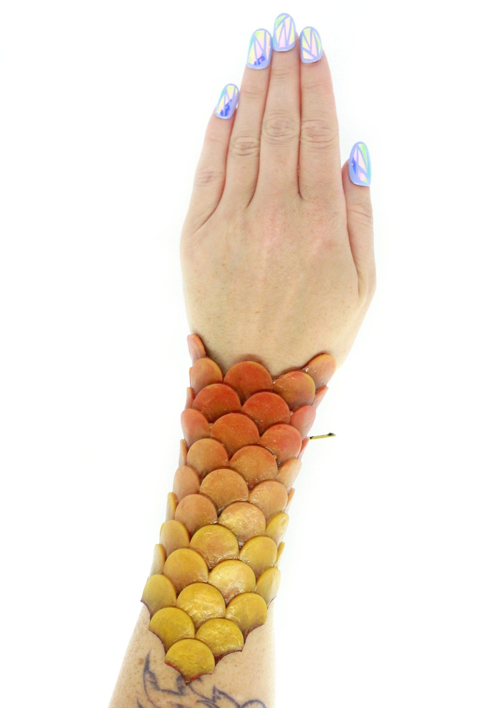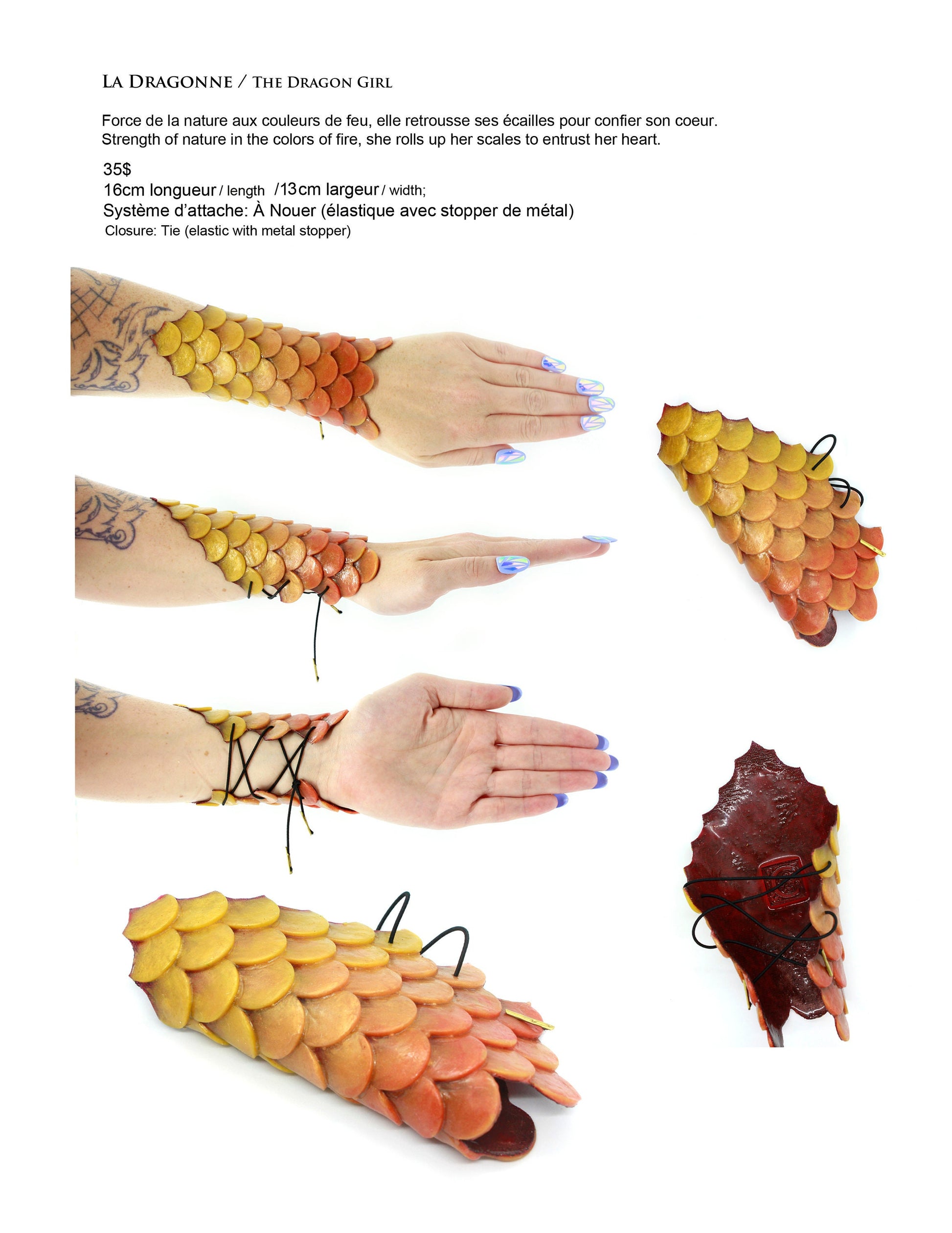 Mermaid scale bracers in silicone, bracelet, jewel, waterproof, adaptable, resistant The DARGON ยซSTRENGHT OF NATURE IN THE COLORS OF FIRE, SHE ROLLS UP HER SCALES TO ENTRUST HER HEART.ยป